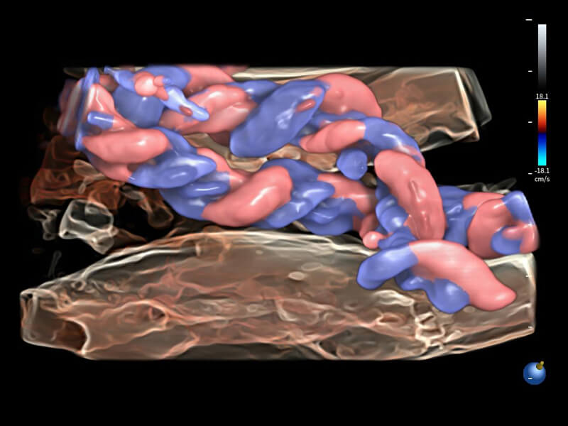 Bright Flow bietet eine 3D-ähnliche Farb-Doppler-Flow-Visualisierung ohne den Einsatz eines Volumenwandlers, wodurch die Grenzdefinition der Gefäßwände verstärkt wird.